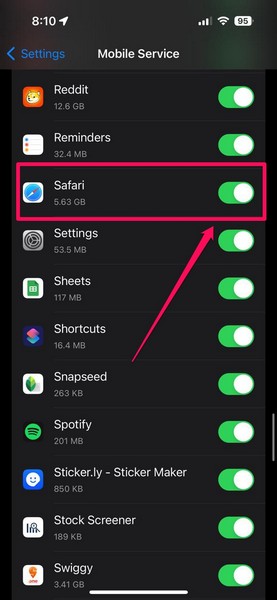 3.Şimdi aşağı kaydırınSafari'yi bulunaltındaMobil Veri Bölümüve sağlamakUygulamanın geçişi etkinleştirildiiPhone'unuzda.
