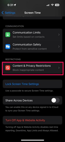 3.Bulmak için aşağı kaydırınİçerik ve Gizlilik Kısıtlamalarıopsiyon veAçmak için dokunun.
