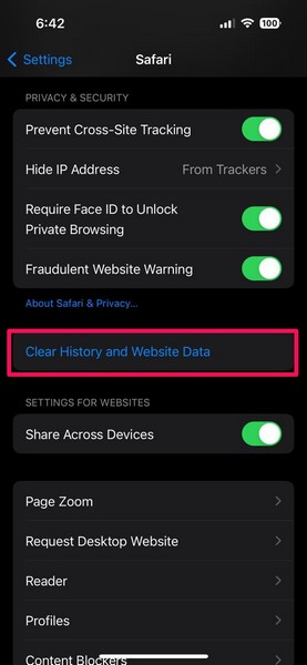Bu nedenle, iPhone'unuzdaki Safari geçmişini ve web sitesi verilerinin temizlenmesinin Safari'nin çalışma sorununu çözme şansı yüksektir. Cihazınızda bunu yapmak için aşağıdaki adımları izleyin: