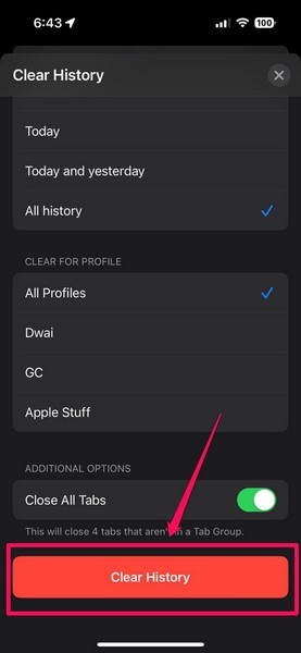 5.Tüm seçimler yapıldıktan sonra,Açık tarihİPhone'unuzdaki tüm safari verilerini temizlemek için düğme.