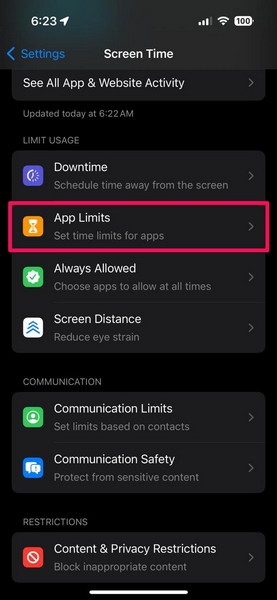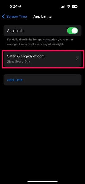 5.Ancak, sadece istiyorsanSafari için ekran süresi sınırını devre dışı bırakın veya silinve/veya cihazınızdaki diğer web siteleri,Belirli uygulama sınırını bulunVeAçmak için dokunun.