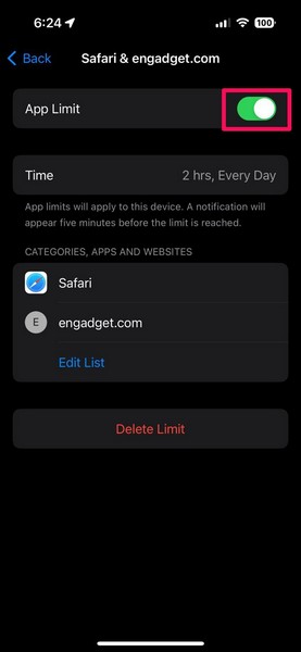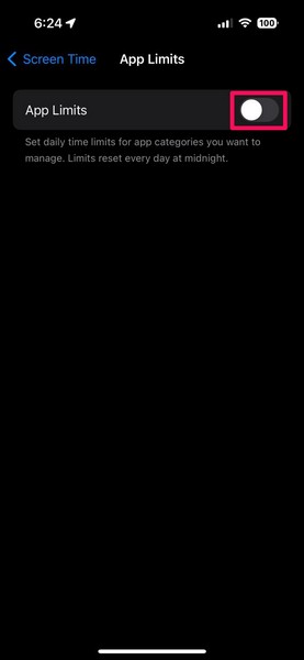 4.Şimdi istersenUygulama sınırlarını tamamen kapatınCihazınızda basitçe yapabilirsinizGeçişe dokununözelliği devre dışı bırakmak için. Bu, cihazdaki tüm uygulamalar, oyunlar ve web siteleri için ayarlanan tüm önceden ayarlanmış sınırları devre dışı bırakacaktır.