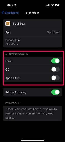 5.Şimdi, ikisi de yapabilirsinSeçilen uzantıyı devre dışı bırakın Belirli safari profilleri içinveyaHepsiiPhone'unuzda.