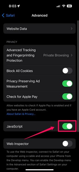 12. İPhone'da Safari için JavaScript'in etkin olduğundan emin olun
