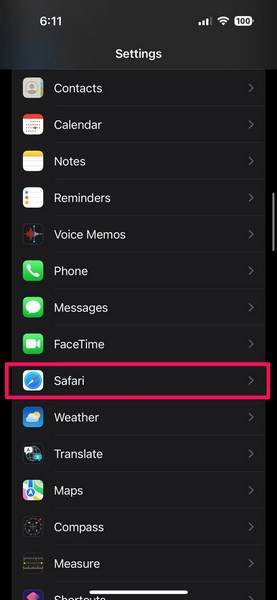 2.Aşağı kaydırınSafari'yi bulunListede veAçmak için dokunun.