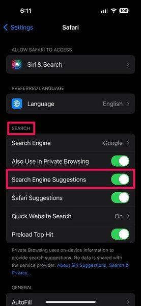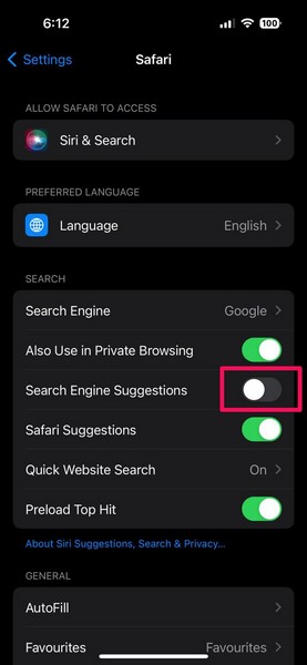 5. İPhone'da Safari için Arama Motoru Önerilerini Devre Dışı Bırak