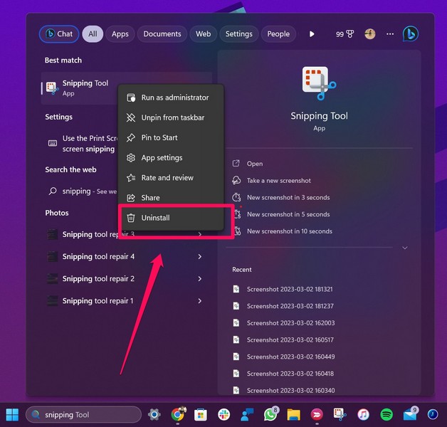 2.Arama sonuçları sayfasında,Snipping aracına sağ tıklayınuygulama ve tıklayınKaldırmakBağlam menüsünde düğme.