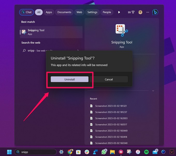 3. Ekrandaki talimatları izleyinWindows 11 cihazınızdan Snipping Tool uygulamasını kaldırmak için.