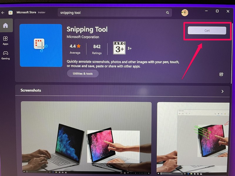 5.Snipping aracı için güncelleme ortaya çıktığında,Elde etmekCihazınıza yüklemek için düğme.