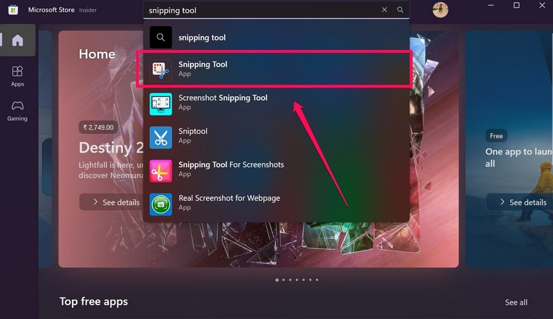 4.Kaldırıldıktan sonra,Microsoft Store'u açınve Snipping Aracı uygulamasını bulmak için arama çubuğunu kullanın.