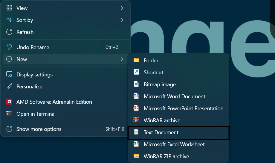 1.İlk olarak, masaüstünüze sağ tıklayın, oku üzerine getirinYeni- Ve sonra seçinMetin belgesiondan seçenek.