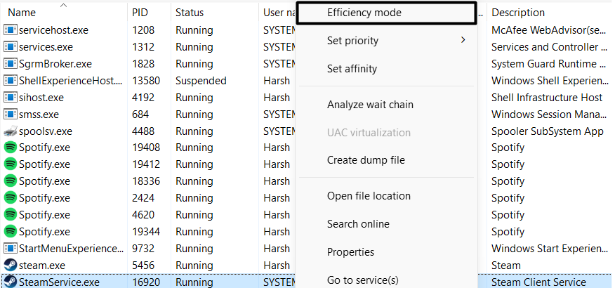2.Ardından, arayınSteamservice.exeGörevDetaylarbölüm,sağ tıklayınüzerinde ve yanında bir kene olmadığından emin olunVerimlilik moduseçenek. Bir kene varsa, buetkinleştirilmiş. Üzerine tıklamalısınVerimlilik moduseçeneğidevre dışı bırakmakBT.