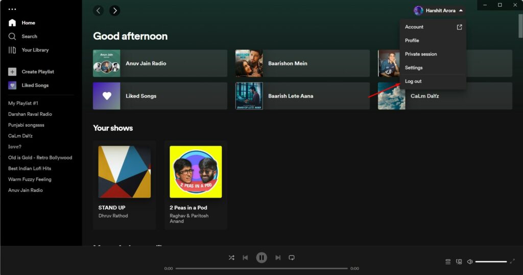 Denemeniz gereken bir sonraki düzeltme, Spotify hesabınızdan çıkış yapmaktır. Tüm listedeki en çalışan ve en kolay düzeltmelerden biridir. Ayrıca, bu düzeltme Spotify teknik ekibi tarafından önerilir. Birçok kullanıcı da bunu yararlı buldu ve sorunu çözdü. Yani, bunun sizin için de işe yarayacak yüksek bir olasılık var. Aşağıdaki adımları izleyerek Spotify hesabınızdan çıkış yapabilirsiniz.