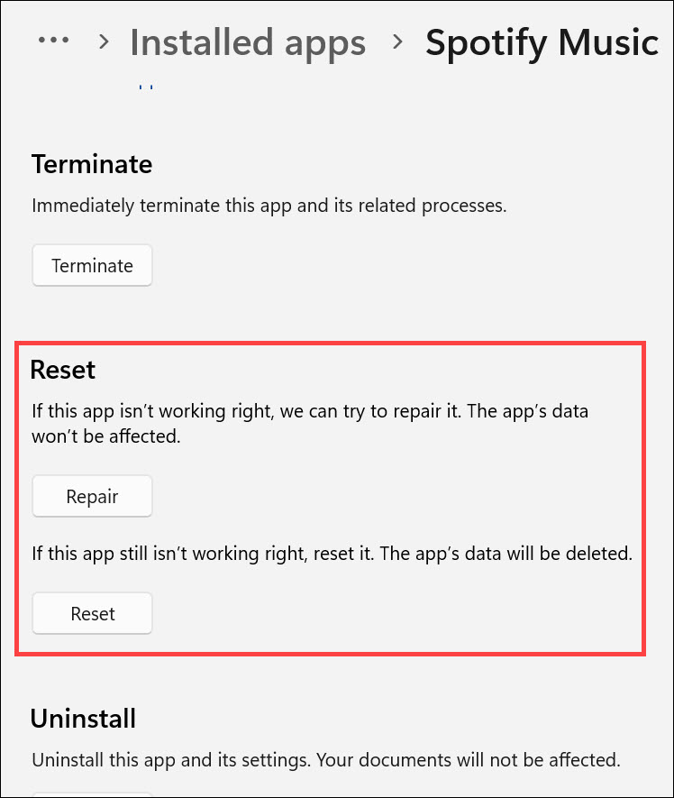 Spotify hala Windows 11'de doğru çalışmıyorsa, uygulamayı Windows 11 ayarlarından onarmayı veya sıfırlamayı deneyebilirsiniz. Bu işlem, soruna neden olabilecek bozuk dosyaları veya ayarları düzeltebilir. İşte yapmanız gerekenler: