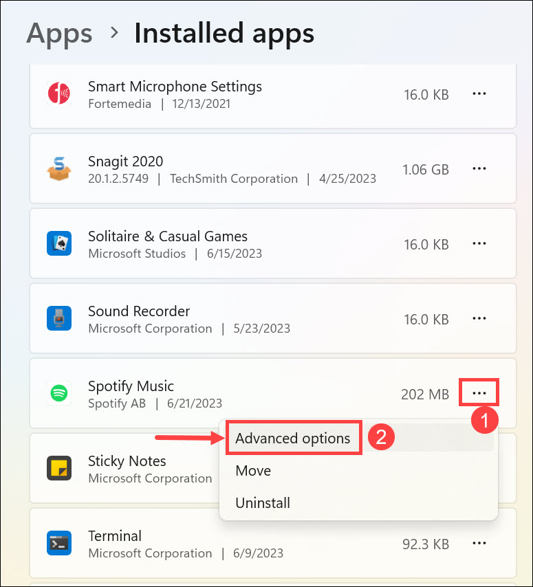 3.Yüklü uygulamalar listesinde ilerleyin, bulunSpotify Müzik, üç noktayı tıklayın ve seçinGelişmiş Seçenekler.