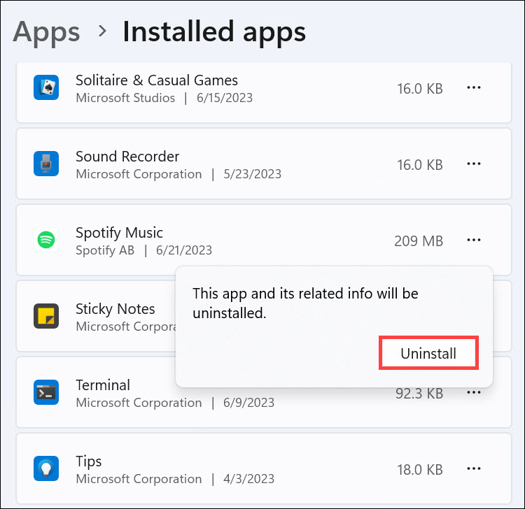 3.Yüklü uygulamalar listesinde ilerleyin, bulunSpotify Müzik, üç noktayı tıklayın ve seçinKaldırmak.