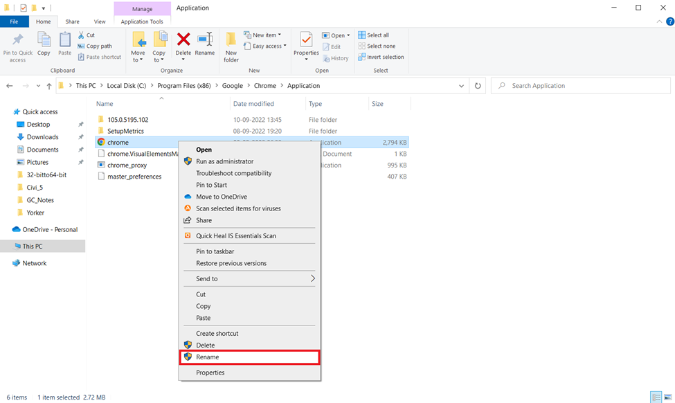 3.Sağ tıklayınChrome Yürütülebilir Dosyave seçYeniden isimlendirmekseçenek.