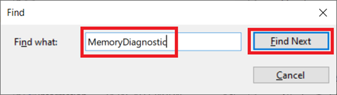 7.TipMemoryDiagnosticüzerindeNe Arama Bulçubuk ve tıklayınSonraki Buldüğme.