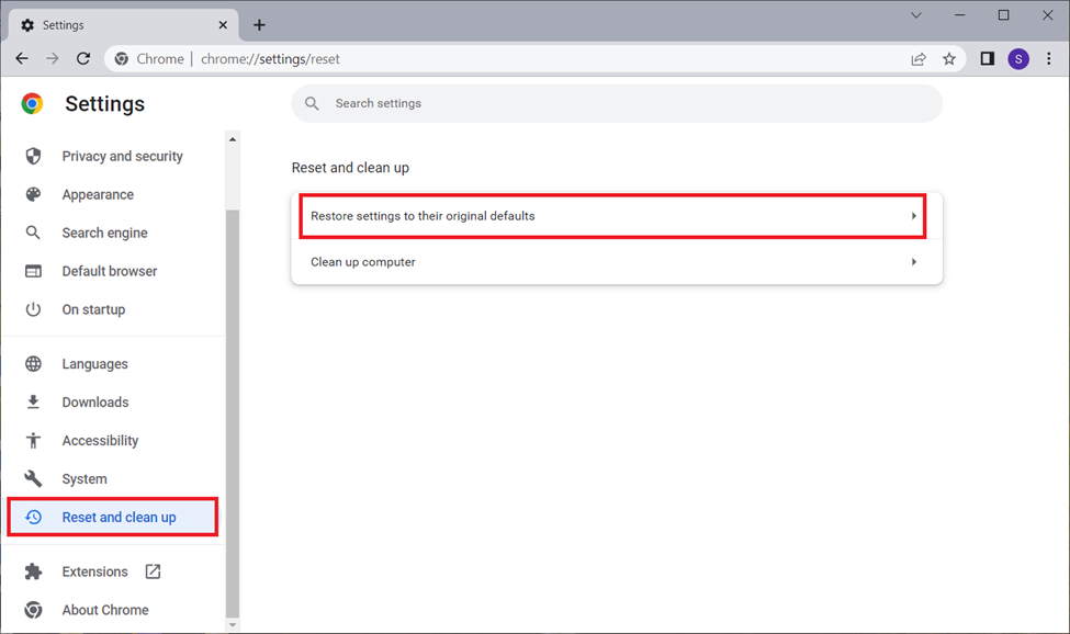 2.ÜzerindeKrom ayarlarısayfa, sol bölmede aşağı kaydırın ve seçinSıfırlayın ve temizleyinseçenek. Sonra tıklayınAyarları orijinal varsayılanlarına geri yükleyinSağdaki.