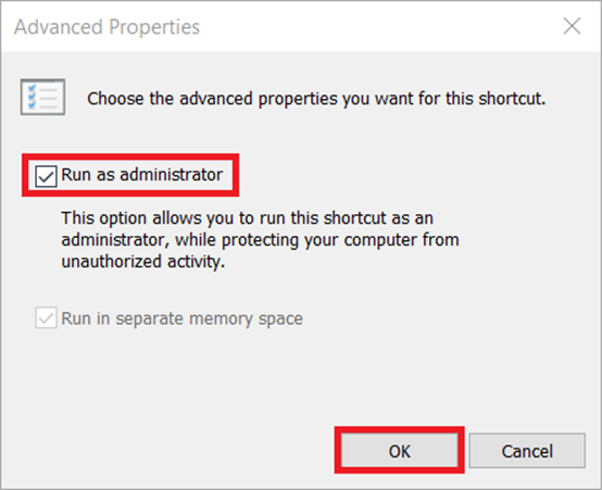 3.ÜzerindeGelişmiş Özellikleristemi, kontrol etYönetici olarak çalıştırKutu ve TıklayınTAMAMyapılan değişiklikleri sonuçlandırmak için.