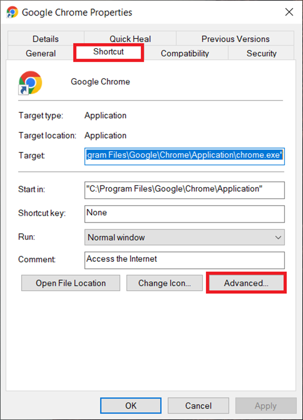 2.ÜzerindeÖzelliklerSayfa, gitKısayolsekme. Sonra tıklayınGelişmişdüğme.