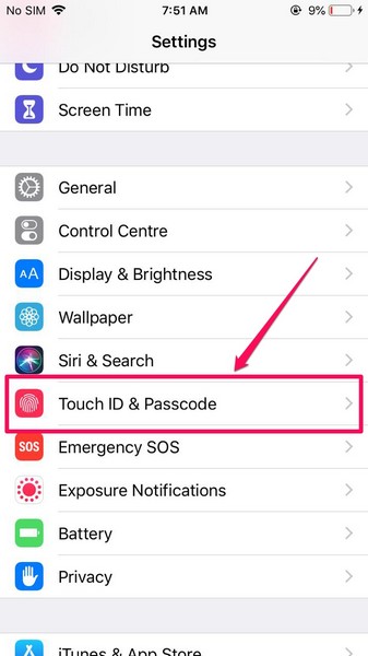 2.BulTouch ID & Passcode seçeneğiListede veAçmak için dokunun.