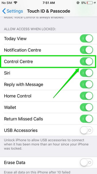 Şimdi, ana bilgisayar düğmesine sahip bir iPhone modeli kullanıyorsanız, kaydırma hareketi cihazınızdaki kontrol merkezini açmalıdır. Ancak, kaydırma hareketinin cihazınız kilitlendiğinde hiçbir şey yapmadığını fark ederseniz, kontrol merkezinin iPhone'unuzdaki Touch ID ve Passcode ayarlarında etkin olduğundan emin olmak isteyebilirsiniz.