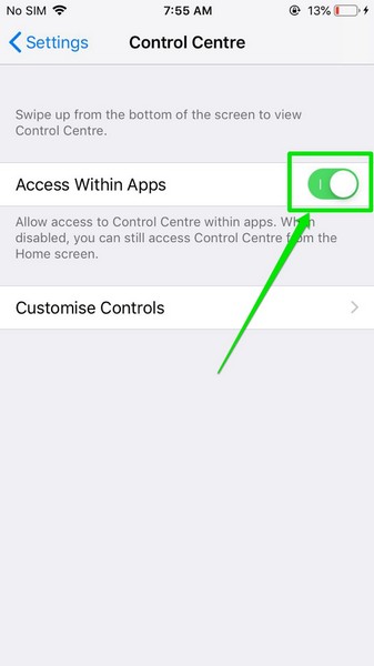 Ev düğmesi tabanlı iPhone modeliniz kilitlendiğinde kontrol merkezini çağırmak için kaydırma hareketini nasıl devre dışı bırakabileceğiniz gibi, cihazda bir uygulama veya oyun kullanırken de aynısını yapabilirsiniz. Bu durumda, iOS cihazınızda uygulamalar içindeki erişim seçeneğinin etkin olduğundan emin olmalısınız.
