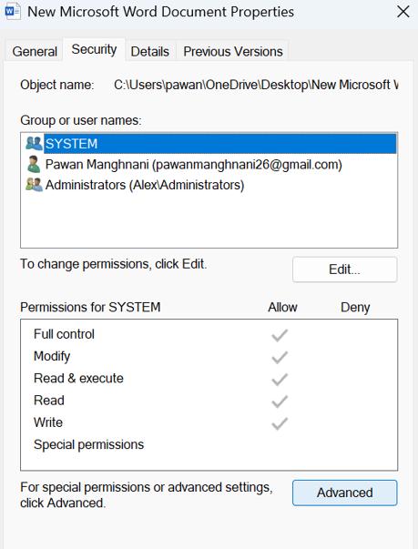 2. Adım:Güvenlik sekmesine ve ardından Gelişmiş düğmesine tıklamanız gereken yeni bir kutu açılacaktır.