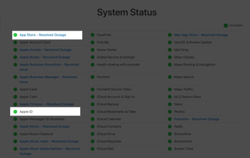 Emin olmak için,Apple'ın Sistem Durum SayfasıVe App Store'un sunucusunun mevcut olup olmadığını kontrol edin (yanında yeşil bir daire ile). Durum göstergesini başka bir renkte görürseniz, App Store şimdi düzgün çalışmıyor.