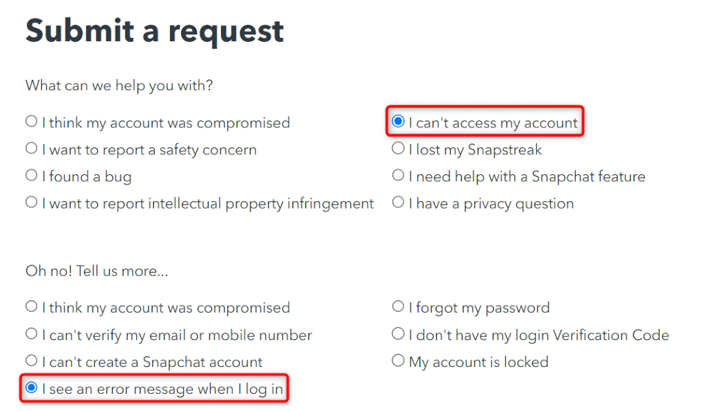 Yukarıdaki yöntemler sorununuzu çözmediyse, son çare Snapchat'in destek ekibiyle iletişime geçmektir. Sorun sonunuz olmayabilir, ancak şirketin destek ekibinin size yardımcı olabileceği Snapchat'in sonunda olabilir.