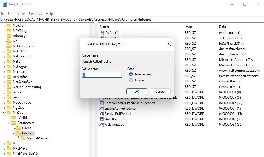 Adım 5:Kayıt Defteri Düzenleyicisinin sağ panelinde EnableActiveProbing DWORD'u bulun ve üzerine sağ tıklayın.
