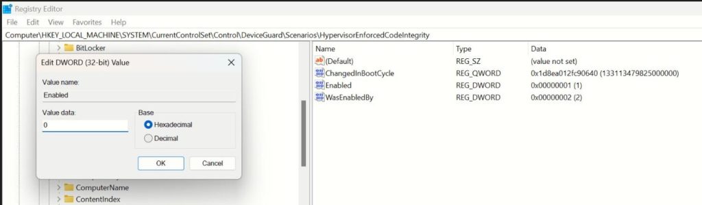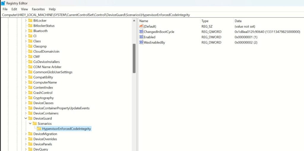 ComputerHKEY_LOCAL_MACHINESYSTEMCurrentControlSetControlDeviceGuardScenariosHypervisorEnforcedCodeIntegrity