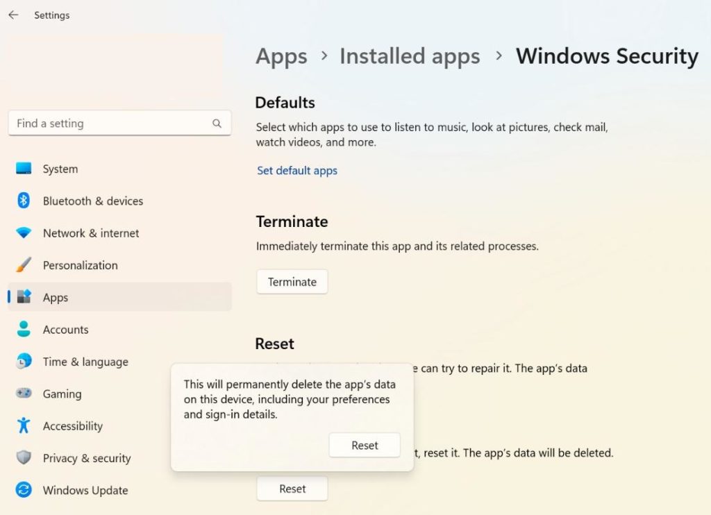 Windows 11 “Bu ayar yöneticiniz tarafından yönetilir” sorunu Windows güvenlik ayarlarındaki bir hata nedeniyle gerçekleşebilir. Bu nedenle, Windows Güvenlik uygulamasını sıfırlamak sizin için harikalar yaratabilir ve bu sorunu çözebilir. İşte bu konuda adımlar: