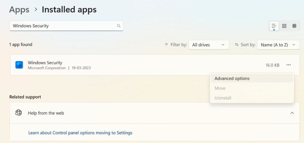 Adım 5:Arama sonuçları göründükten sonra,Windows Güvenliğiuygulama ve seçGelişmiş Seçenekler.