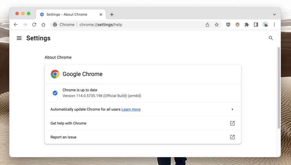 Örneğin, Google Chrome kullanıyorsanız,Krom Menüsü, seçmeAyarlarve seçChrome hakkındakenar çubuğunda. Ardından, Chrome'un en son sürümünü güncelleyene kadar bekleyin.
