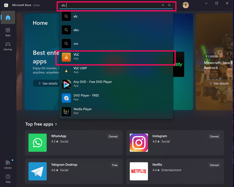 6.Yukarıdaki arama çubuğunu kullanınVLC Media Player uygulamasını bulun.