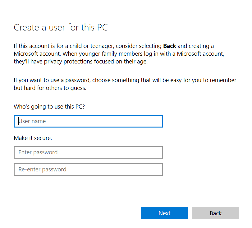 5.Bir sonraki pencereye, yeni kullanıcı hesabı için ayarlamak istediğiniz kullanıcı adını ve şifreyi girin.