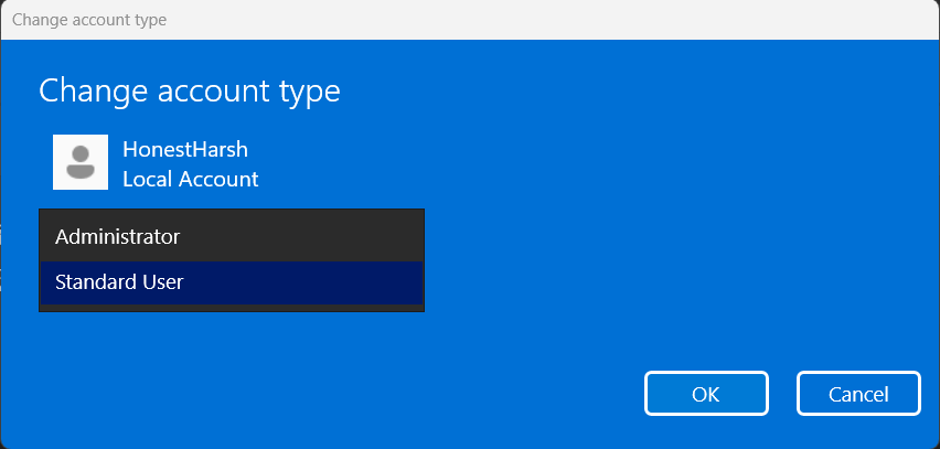 8.AyarlamakHesap türüaçılırYöneticiSeçenek ve TıklayınTAMAMdeğişiklikleri uygulamak için.