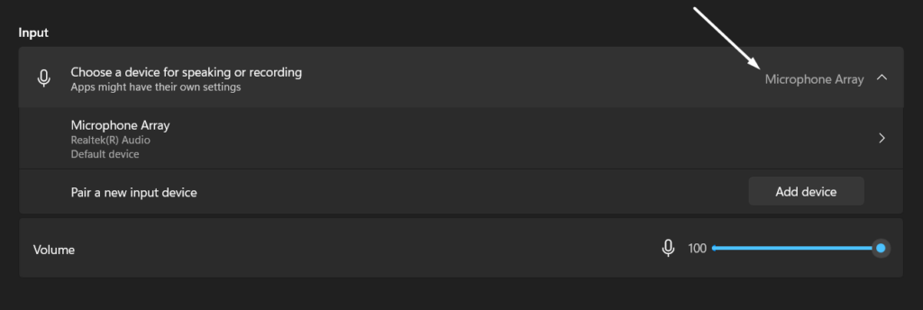 3.Üzerine tıklayınSes girişi…Seçenek AltındaMikrofonve varsayılan olarak ayarlamak istediğiniz cihazı seçin.