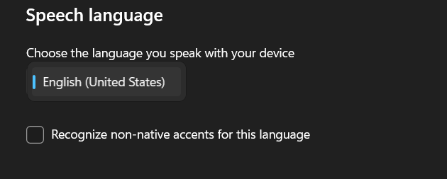 3.Tercih ettiğiniz konuşma dilini seçinKonuşma diliaçılır menü, ardındanBu dil için anadili olmayan aksanları tanıyınonay kutusu.