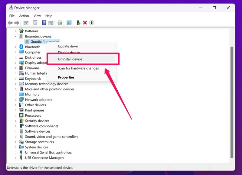 PC'nizdeki veya dizüstü bilgisayarınızdaki parmak izi sürücüsünü güncelledikten sonra, Windows 11 sayısında çalışmayan Windows Hello Parmak İzi tanıma ile karşılaşıyorsanız, sürücüyü yeniden yüklemeyi deneyebilirsiniz. Bu, sürücüdeki parmak izi tanıma sisteminin Windows 11'de arızalanmasına neden olabilecek küçük sorunları çözebilir ve uygun oturum açma seçeneğini bir kez daha çalıştırabilir. Windows 11 PC veya dizüstü bilgisayarınızdaki biyometrik sürücüyü yeniden yüklemek için aşağıdaki adımları izleyin: