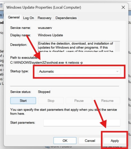 4.Burada, emin olunBaşlangıç türüayarlanmışOtomatik. Değilse, kutuyu tıklayın, otomatik seçeneği seçin veUygula düğmesialtında.