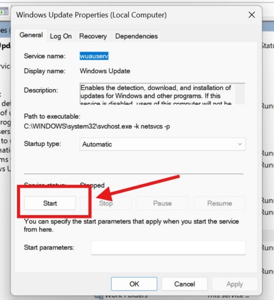 5.Sonra tıklayınBaşlat düğmesiCihazınızdaki Windows Güncelleme Hizmetini başlatmak için.