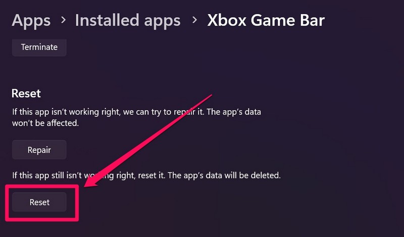 1.AçGelişmiş SeçeneklerYukarıdaki adımları kullanarak Xbox Game Bar uygulaması için sayfa.