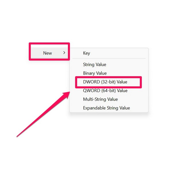 6.Orada değilse, boş bir alana sağ tıklayın, imleci devreye alınYenive seçDWORD (32 bit) değerbağlamda.