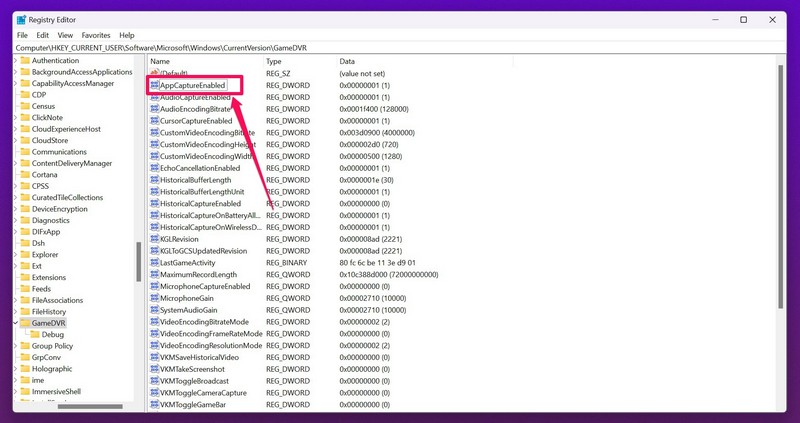 7.Anahtar oluşturulduktan sonraAppCaptureEnabled adresini yeniden adlandırın.