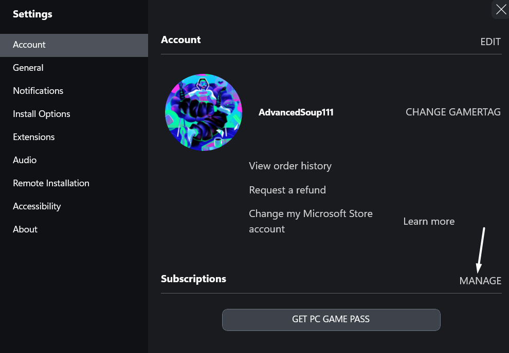 2.İçindeXbox uygulaması, sol üstteki profili tıklayın ve açılır listeden,Ayarlarseçenek.