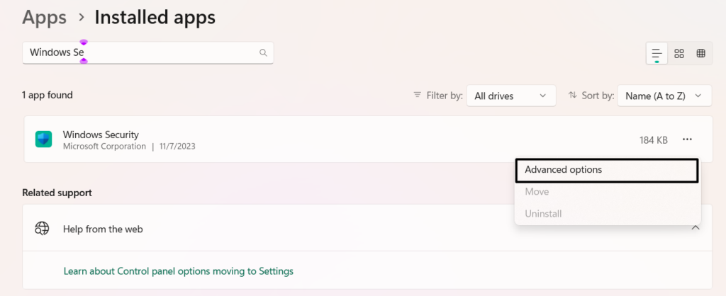 2.SeçmekYüklü uygulamalarVe bir sonraki ekranda bulWindows Güvenliğive tıklayınÜç nokta (…)yanında.