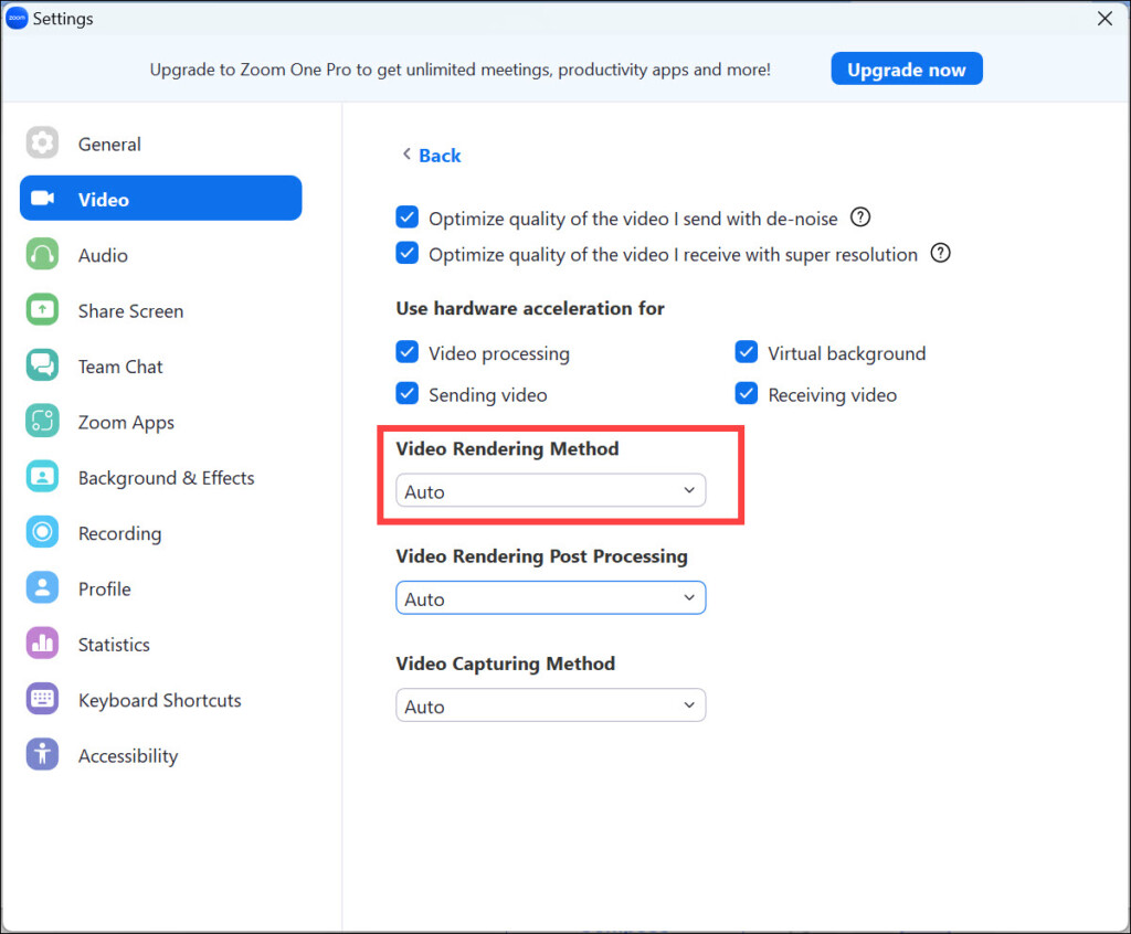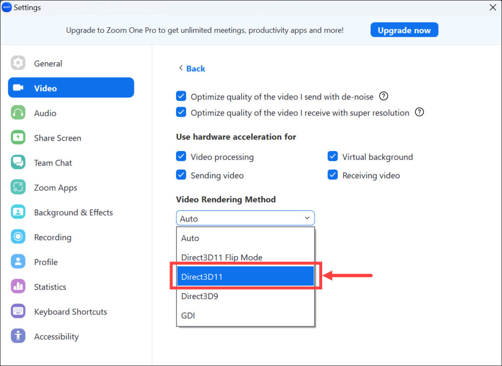 Entegre bir grafik kartı kullanıyorsanız, Zoom'da video oluşturma ayarlarını değiştirmeyi denemek isteyebilirsiniz. Bu, uygulamanın grafik kartınızla düzgün çalışamamasıyla ilgili sorunları çözebilir. İşte nasıl: